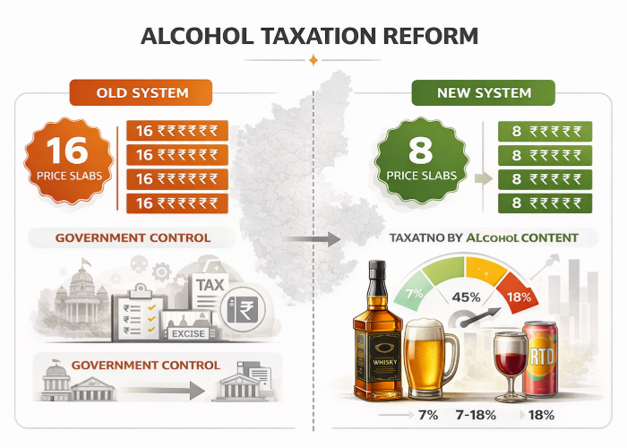 Announced as part of the Karnataka Budget 2026–27, the reforms aim to modernise the state’s six-decade-old excise framework while maintaining strong revenue growth from alcohol, one of the state’s largest non-GST income sources.
